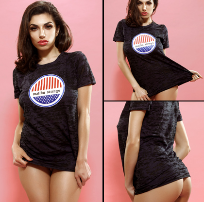 A shirt so sexy and comfortable you will never want to take it off. Semi-sheer burnout tee with ½" ribbed banding at crew neck features and over sized "Malibu Strings" flag. Colors: White, Black. Material Contents: 50% Cotton/50% Polyester. Made in the USA. Care Instructions: Wash cold. It is the nature of this fabric to pill after several washings. This is the desired look of the shirt. For sizing information click here. | |