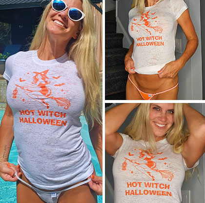 A shirt so sexy and comfortable you will never want to take it off. Semi-sheer burnout tee with ½" ribbed banding at crew neck features a beautiful print. Hot Witch Halloween patch on the left sleeve. Color: White. Material Contents: 50% Cotton/50% Polyester. Made in the USA. Care Instructions: Wash cold. It is the nature of this fabric to pill after several washings. This is the desired look of the shirt. For sizing information click here. | |