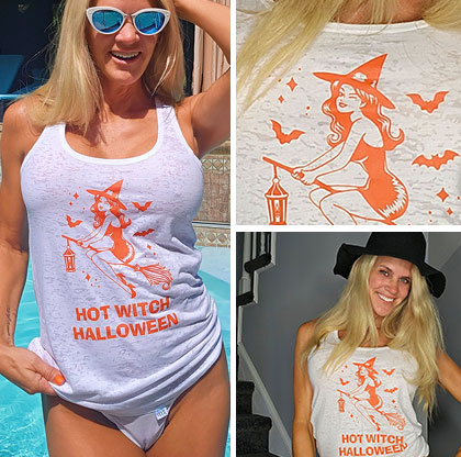 A tank so sexy and comfortable you will never want to take it off. Semi-sheer burnout tank with ½" ribbed banding at crew neck features a beautiful print. Hot Witch Halloween. Color: White. Material Contents: 50% Cotton/50% Polyester. Made in the USA. Care Instructions: Wash cold. It is the nature of this fabric to pill after several washings. This is the desired look of the shirt. For sizing information click here. | |